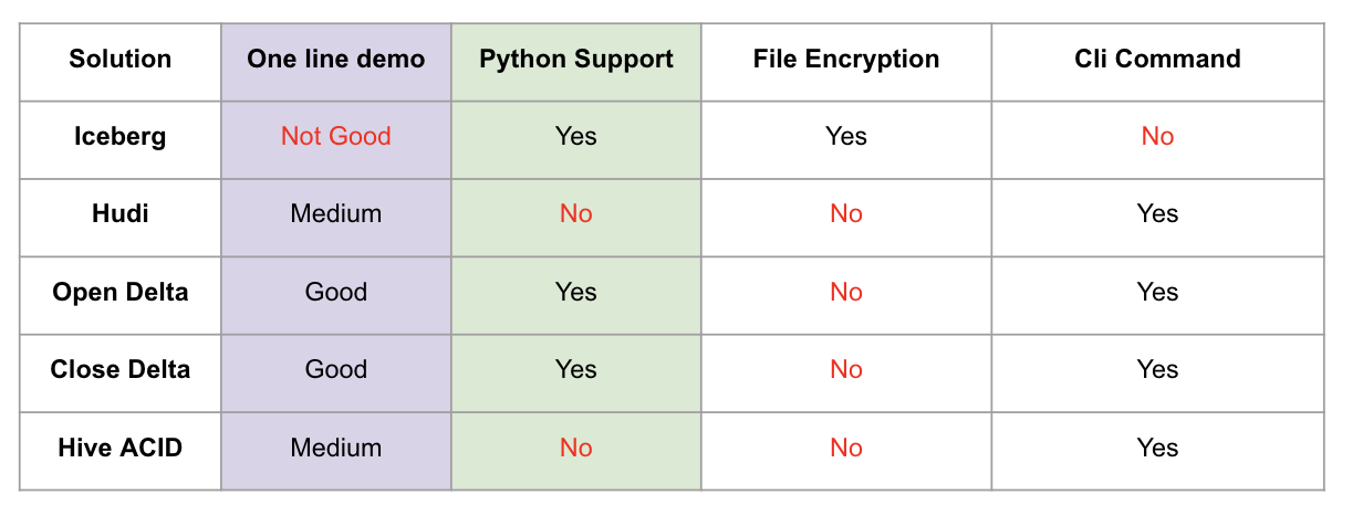 这里 One line demo 指的是,示例 demo 是否足够简单,体现了方案的易用性,Iceberg 稍微复杂一点(我认为主要是 Iceberg 自己抽象出了 schema,所以操作前需要定义好表的 schema)。做得最好的其实是 Delta,因为它深度跟随 Spark 易用性的脚步。