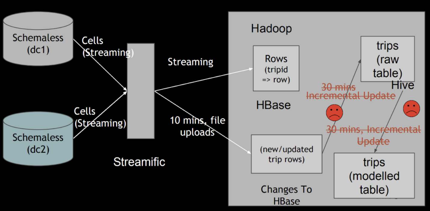 Uber 的业务场景主要为:将线上产生的行程订单数据,同步到一个统一的数据中心,然后供上层各个城市运营同事用来做分析和处理。在 2014 年的时候,Uber 的数据湖架构相对比较简单,业务日志经由 Kafka 同步到 S3 上,上层用 EMR 做数据分析;线上的关系型数据库以及 NoSQL 则会通过 ETL(ETL 任务也会拉去一些 Kakfa 同步到 S3 的数据)任务同步到闭源的 Vertica 分析型数据库,城市运营同学主要通过 Vertica SQL 实现数据聚合。当时也碰到数据格式混乱、系统扩展成本高(依赖收 Vertica 商业收费软件)、数据回填麻烦等问题。后续迁移到开源的 Hadoop 生态,解决了扩展性问题等问题,但依然碰到 Databricks 上述的一些问题,其中最核心的问题是无法快速 upsert 存量数据。