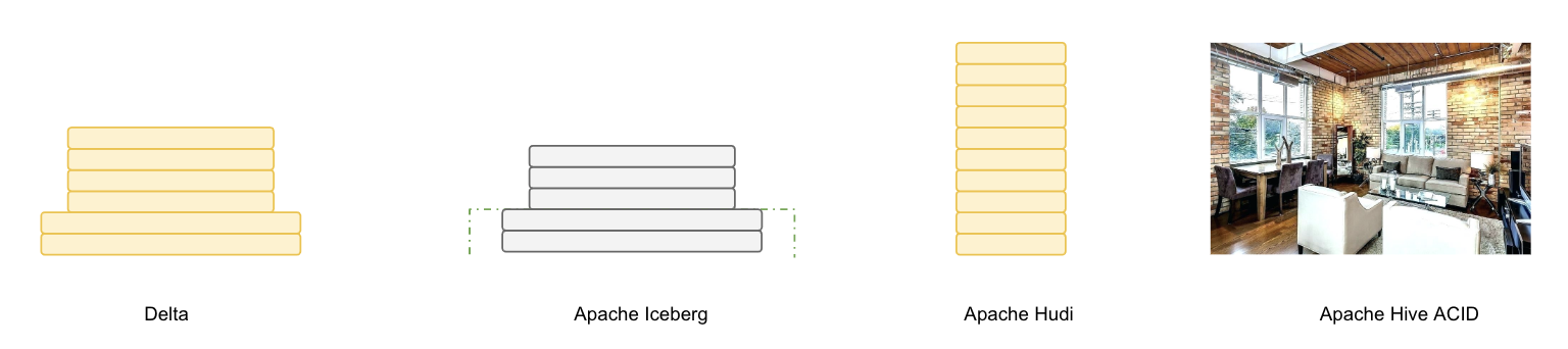 如果用一个比喻来说明 Delta、Iceberg、Hudi、Hive-ACID 四者差异的话,可以把四个项目比做建房子。由于开源的 Delta 是 Databricks 闭源 Delta 的一个简化版本,它主要为用户提供一个 table format 的技术标准,闭源版本的 Delta 基于这个标准实现了诸多优化,这里我们主要用闭源的 Delta 来做对比。