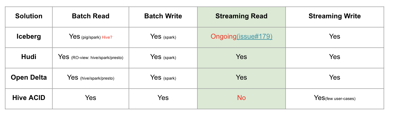 目前 Iceberg 和 Hive 暂时不支持流式消费,不过 Iceberg 社区正在 issue 179 上开发支持。