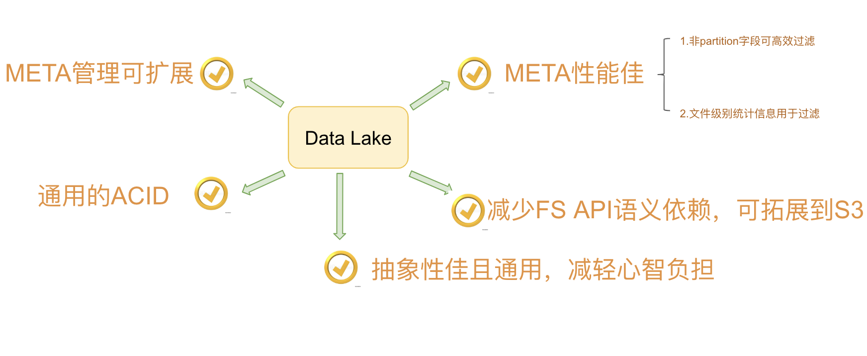 他们发现 Hive 的元数据依赖一个外部的 MySQL 和 HDFS 文件系统,通过 MySQL 找到相关的 parition 之后,需要为每个 partition 去 HDFS 文件系统上按照分区做目录的 list 操作。在文件量大的情况下,这是一个非常耗时的操作。同时,由于元数据分属 MySQL 和 HDFS 管理,写入操作本身的原子性难以保证。即使在开启 Hive ACID 情况下,仍有很多细小场景无法保证原子性。另外,Hive Metastore 没有文件级别的统计信息,这使得 filter 只能下推到 partition 级别,而无法下推到文件级别,对上层分析性能损耗无可避免。最后,Hive 对底层文件系统的复杂语义依赖,使得数据湖难以构建在成本更低的 S3 上。