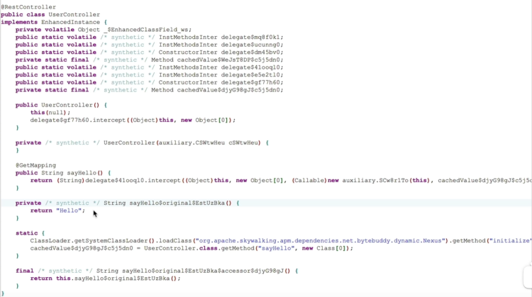 假设我们有一个Controller,里面只有一个sayHello方法返回"Hello",经过Skywalking增强后,反编译一下它被增强后的字节码文件: