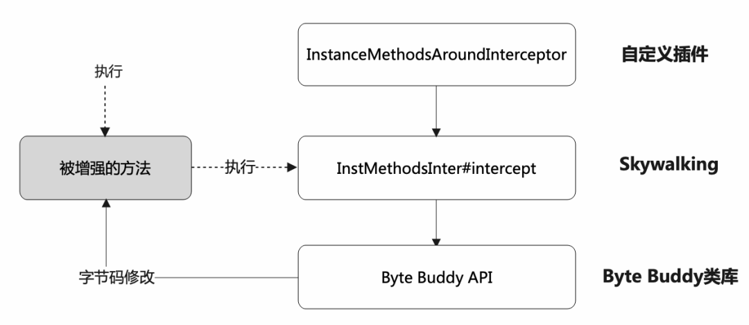 InstMethodsInter封装用户自定义的逻辑,并且对接ByteBuddy的核心类库,当执行到被字节码增强的方法时会执行InstMethodsInter的intercept方法(可以和上面反编译被增强后类的字节码文件进行对比):