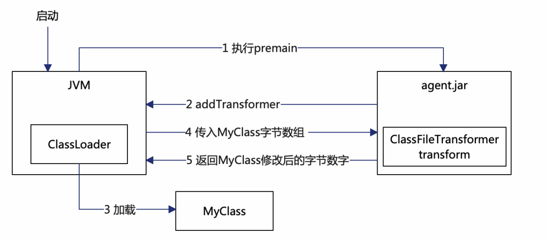 1、目标JVM通过javaagent参数启动后找到指定的agent,执行agent的premain方法;