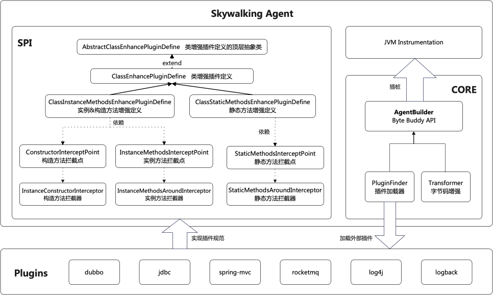 左侧SPI部分是Skywalking暴露的插件规范接口,开发者根据这些接口实现插件。右侧Core部分负责加载插件并且利用Byte Buddy提供的字节码增强逻辑对应用中指定类和方法的字节码进行增强。