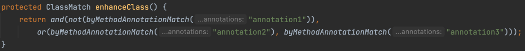 这段逻辑表示需要增强不带annotation1注解,并且带有annotaion2注解或annotaion3注解的方法的字节码。ClassMatch通过Builder模式提供用户流式编程的方式,最终Skywalking会将用户提供的一串ClassMatch构建出一个内部使用的类匹配逻辑。