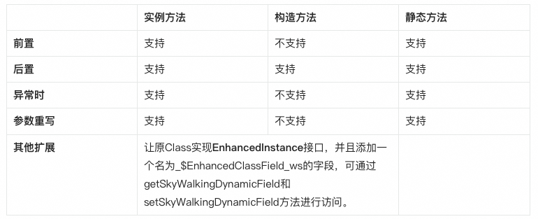 知道了需要增强哪个类的哪个方法,那下一步就是如何增强。Java中的方法可以分为静态方法、实例方法和构造方法三类方法,Skywalking对于这三种方法的增强逻辑为用户提供了不同的扩展点: