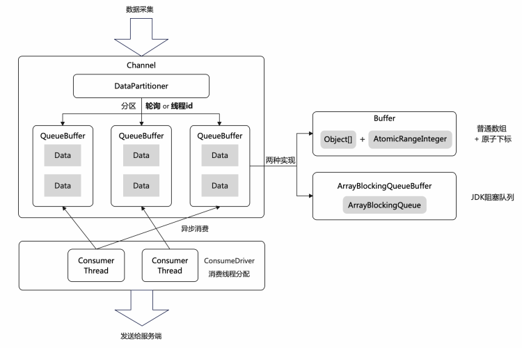 Skywalking在实现上有所区别,采用分区的QueueBuffer存储Trace数据,多个消费线程通过Driver平均分配到各个QueueBuffer上进行数据消费: