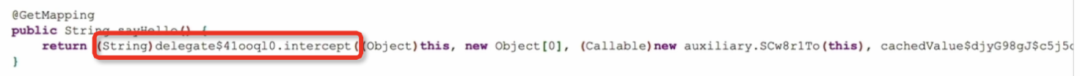 2、原来的syHello方法名被修改了但仍保存下来,并且新生成了一个增强后的sayHello方法,静态代码块里将经过字节码增强后的sayHello方法存入缓存字段。