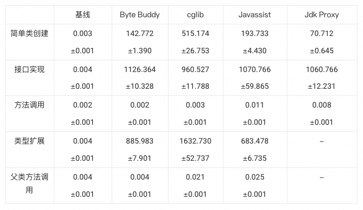 上图中的对比项我们可以大致分为两个方面:生成快速代码(方法调用、父类方法调用)和快速生成代码(简单类创建、接口实现、类型扩展),我们理所应当要优先选择前者。从数据可以看出Byte Buddy在纳秒级的精度下,在方法调用和父类方法调用上和基线基本没有差距,而位于其后的是cglib。