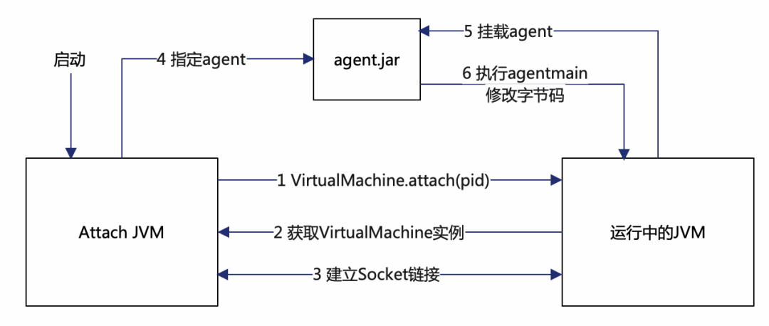 2、Attach JVM指定目标JVM需要挂载的agent.jar包,挂载成功后会执行agent包中的agentmain方法,此时就可以对目标JVM中类的字节码进行修改;