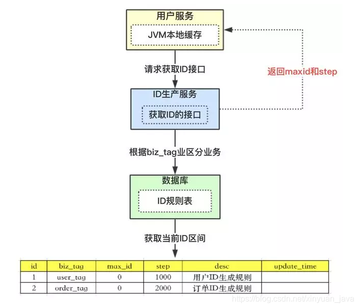 3、【生成ID服务】把max_id和step返回给【用户服务】;并且把max_id更新为max_id = max_id + step,
