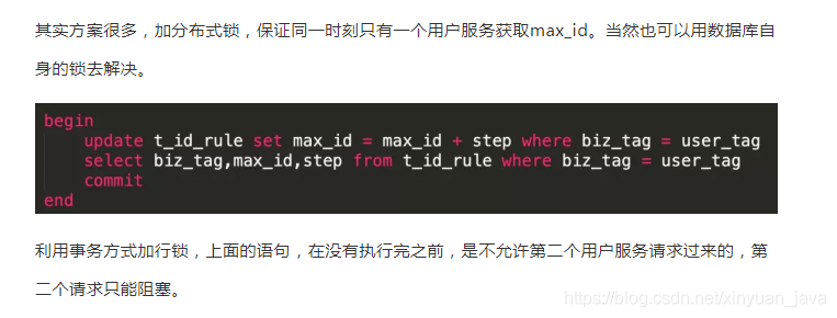 如用户服务A,取到的max_id=1000 ;用户服务B取到的也是max_id=1000,那就出现了问题,Id重复了。那怎么解决?