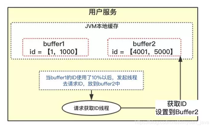 双buffer的方案,小伙伴们有没有感觉很酷,这样就达到了业务场景用的ID,都是在jvm内存中获得的,从此不需要到数据库中获取了。允许数据库宕机时间更长了。