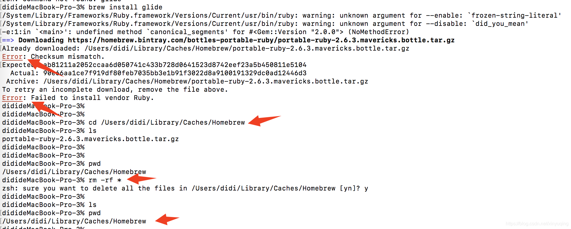 1、删除Homebrew文件夹下所有文件 cd /Users/xinyuqing/Library/Caches/Homebrew