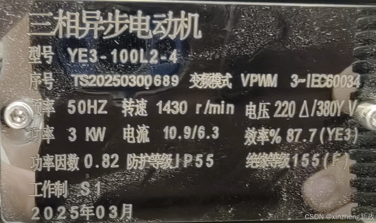 - 型号:“YE3 - 100L2 - 4”,YE3系列属于高效三相异步电动机,符合相关能效标准;“100”表示机座中心高为100mm;“L”表示长机座(机座长度代号,还有S短机座、M中机座);“2”表示铁芯长度序号;“4”表示极数为4极。