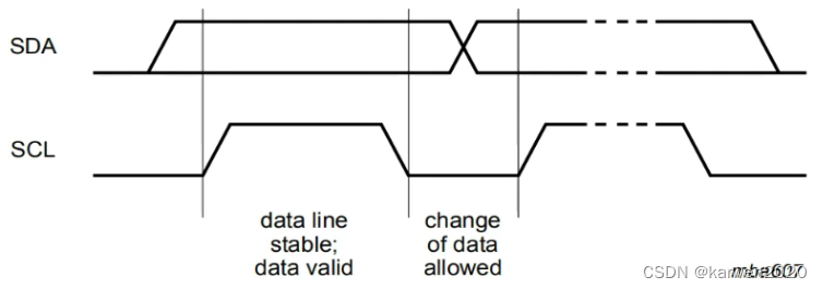 2、数据传输:主机(Master)或从机(Slaver)在SCL高电平(上升沿)时读取SDA上的信号,在SCL低电平是,SDA完成传输位信号的改变。数据传输时,高位先进行传输(MSB),一次传输的最大传输Byte位数无限制。