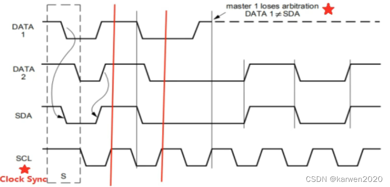 利用时钟同步的SCL上升沿对SDA采样,如果DATA1和DATA2全程和SDA上一致,则双主机都能同时访问同一个从机;如果DATA1先和SDA不一致,则DATA2的Master获取主动权,继续完成相关操作,DATA1的主机丢失总线SDA的控制权,并关闭DATA1的输出。
