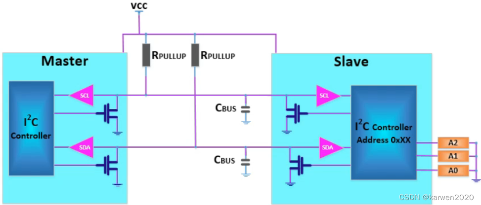 2、总线通过上拉电阻接到电源,当I2C设备空闲时,MOSFET关断,输出高阻态。