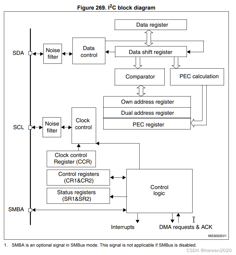 STM32的I2C外设可用作通信的主机以及从机,支持100kbps和400kbps的速率,支持7位、10位设备地址,支持DMA数据传输,并且具有数据校验功能。