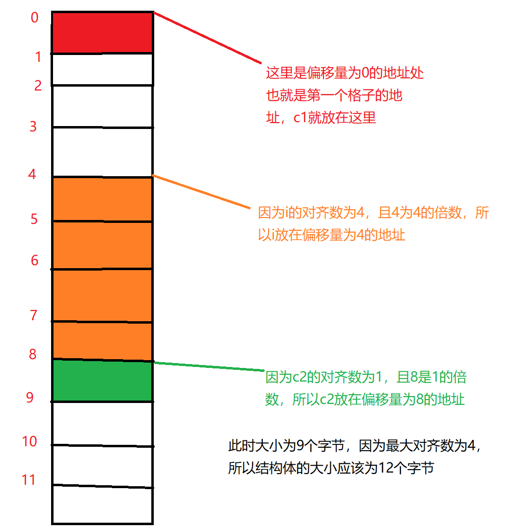从第二个成员开始,其他成员要对其到其对齐数的整数倍的偏移量的地址处(对齐数=编译器的默认对齐数与该成员大小 的较小值,且结构体的对齐数为其成员的最大对齐数)