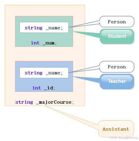 我们把公共的成员都放到Person类中,Student和teacher都继承Person,就可以复用Person成员,不需要重复定义了。