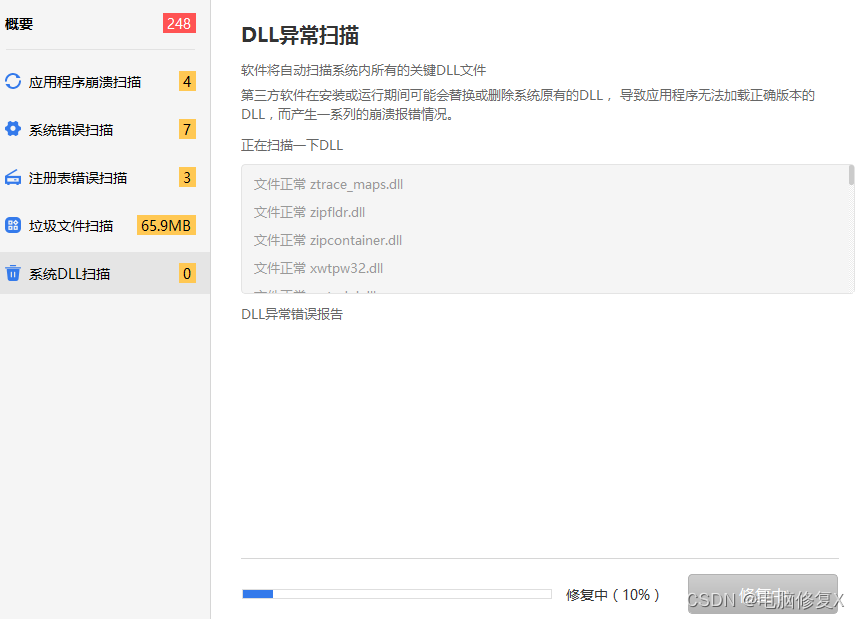 4)点击一键修复dll错误的按钮,就会自动的帮你扫描电脑系统中缺失的dll文件