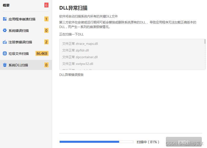 点击一键修复dll错误的按钮,就会自动的帮你扫描电脑系统中缺失的dll文件