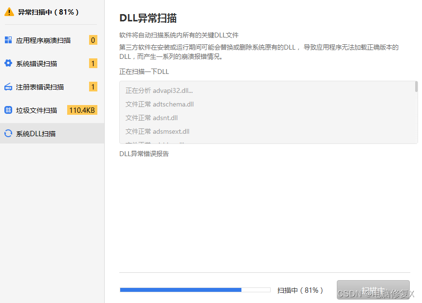 点击一键修复dll错误的按钮,就会自动的帮你扫描电脑系统中缺失的dll文件