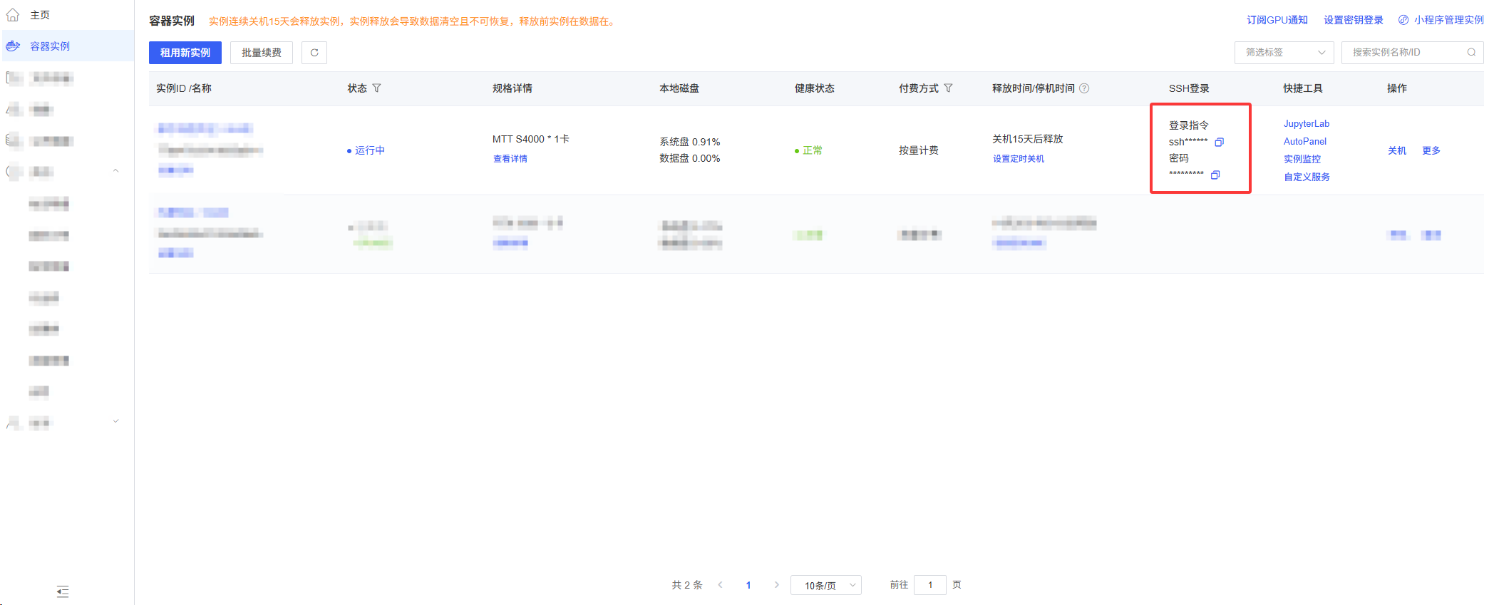 这边以算力云平台为参考,其他的平台可自行搜索一下ssh指令的方式
