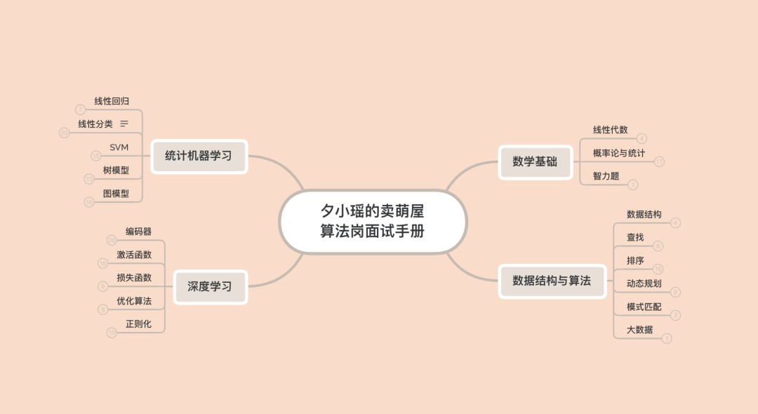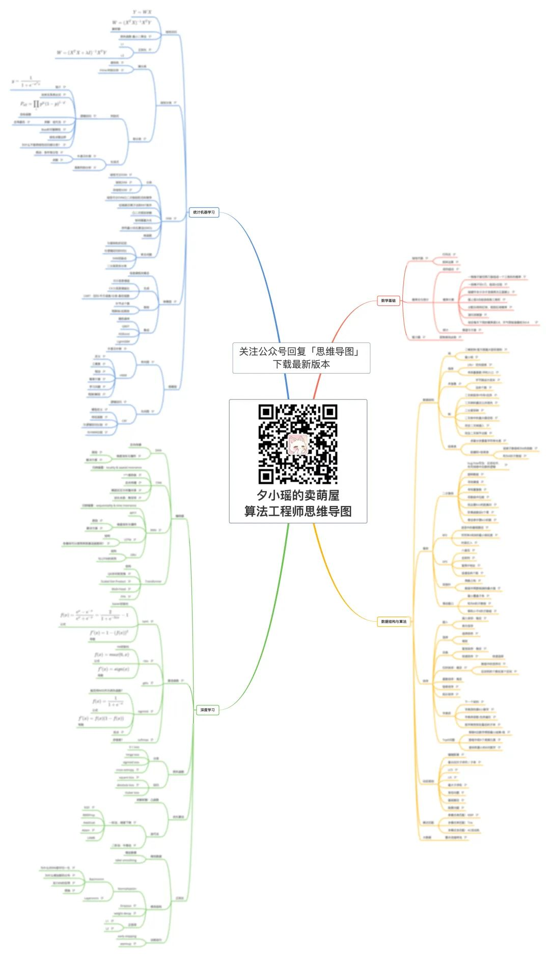 卖萌屋的妹子们(划掉)作者团整理的算法工程师思维导图,求职/自我提升/查漏补缺神器。该手册一共分为数据结构与算法、数学基础、统计机器学习和深度学习四个部分。