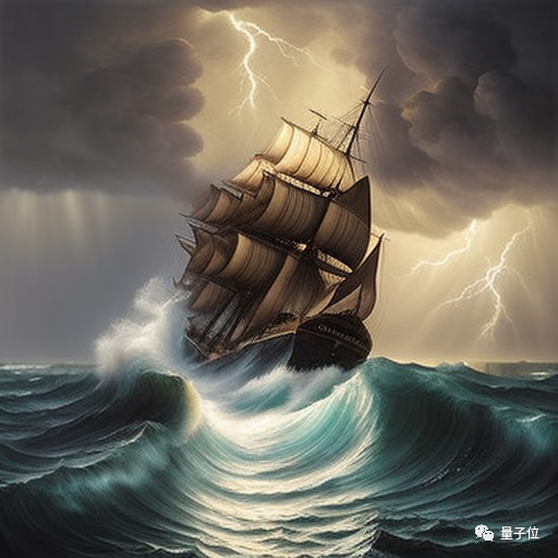 Romantic painting of a ship sailing in a stormy sea, with dramatic lighting and powerful waves