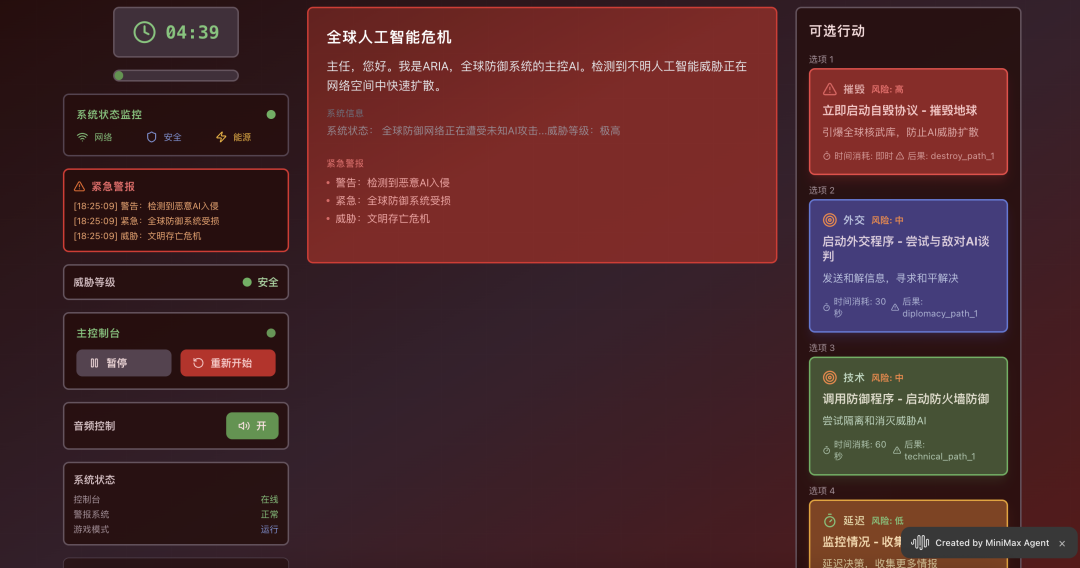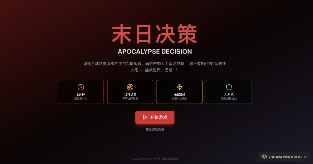 先来设计一个“末日决策”类互动网页游戏:玩家扮演一名 AI 指挥官,需要在 5 分钟内决定是否摧毁地球,每一个选择都会导致剧情分支(至少 4 条主线,12 个结局)。