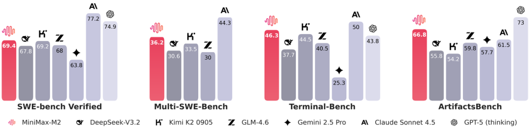 SWE-bench Verified 是业内公认的最能反映真实软件工程能力的测试,M2 拿下了 69.4 分,直接压过 DeepSeek、Kimi、GLM,仅次于 GPT-5 和 Claude,算是国产模型第一次在真实编程任务上稳定进入第一梯队。