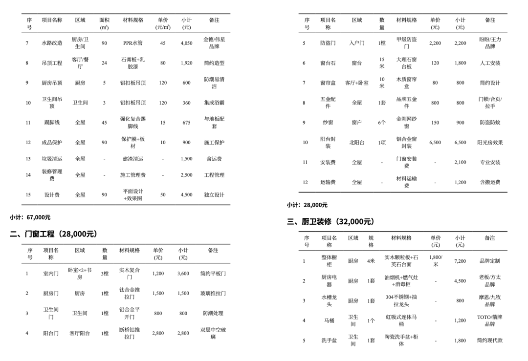 甚至每个区域装修建议都有备注说明。非常接近真实家装公司的交付标准。
