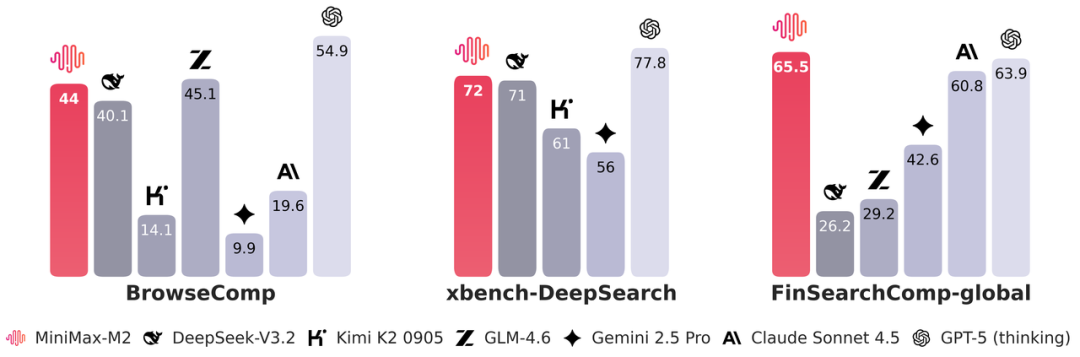 两个榜单的表现 M2 同样也是稳定的 top 发挥。FinSearchComp-global 是字节推出的金融搜索基准,考验专业领域的检索和分析能力。M2 更是爆力登顶,65.5 分分,全球第一。