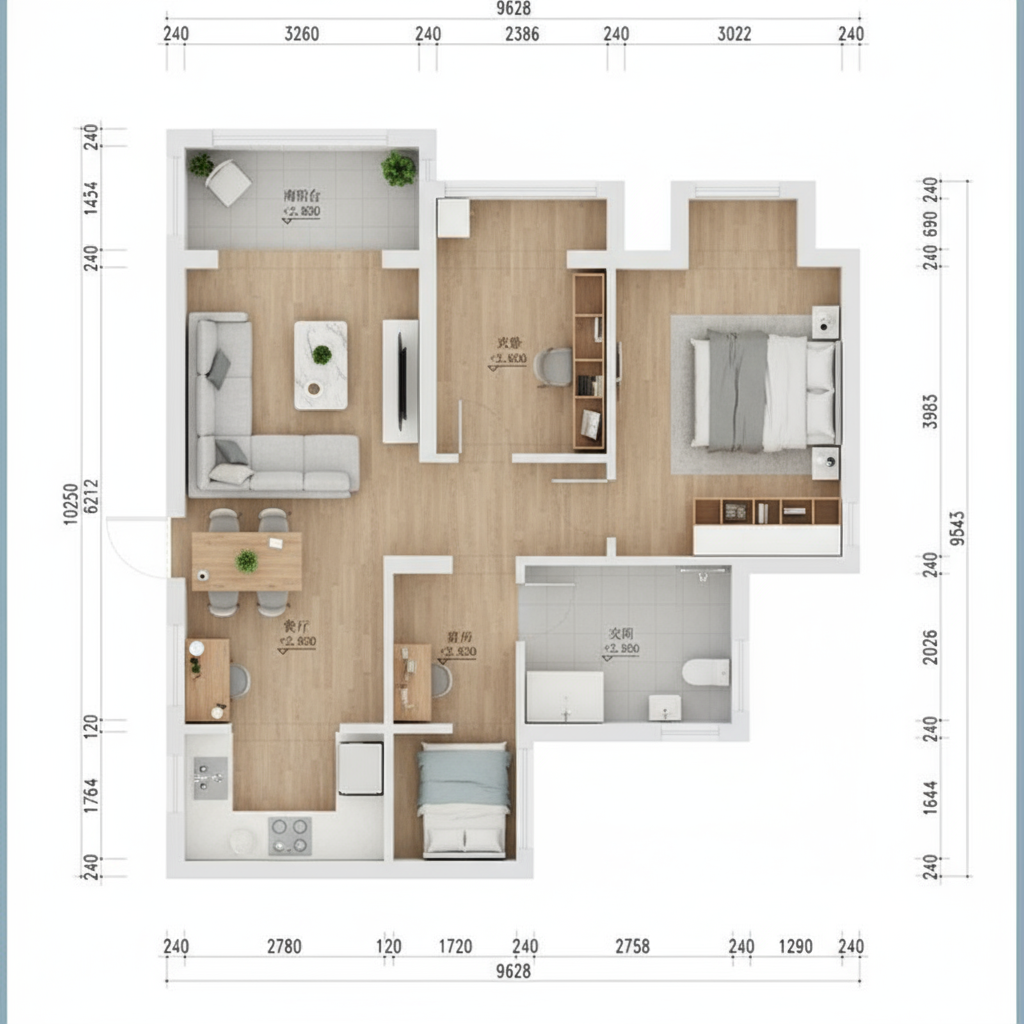 按照“俯视角 + 简约现代风”这类设计师级指令,自动生成了一张拟真度很高的 3D 布局草图。