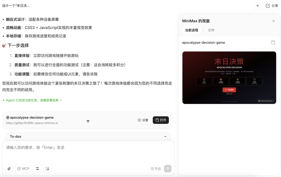 MiniMax Agent 已经全面接入 M2 模型,完全不需要写一行代码,就能完成复杂任务。