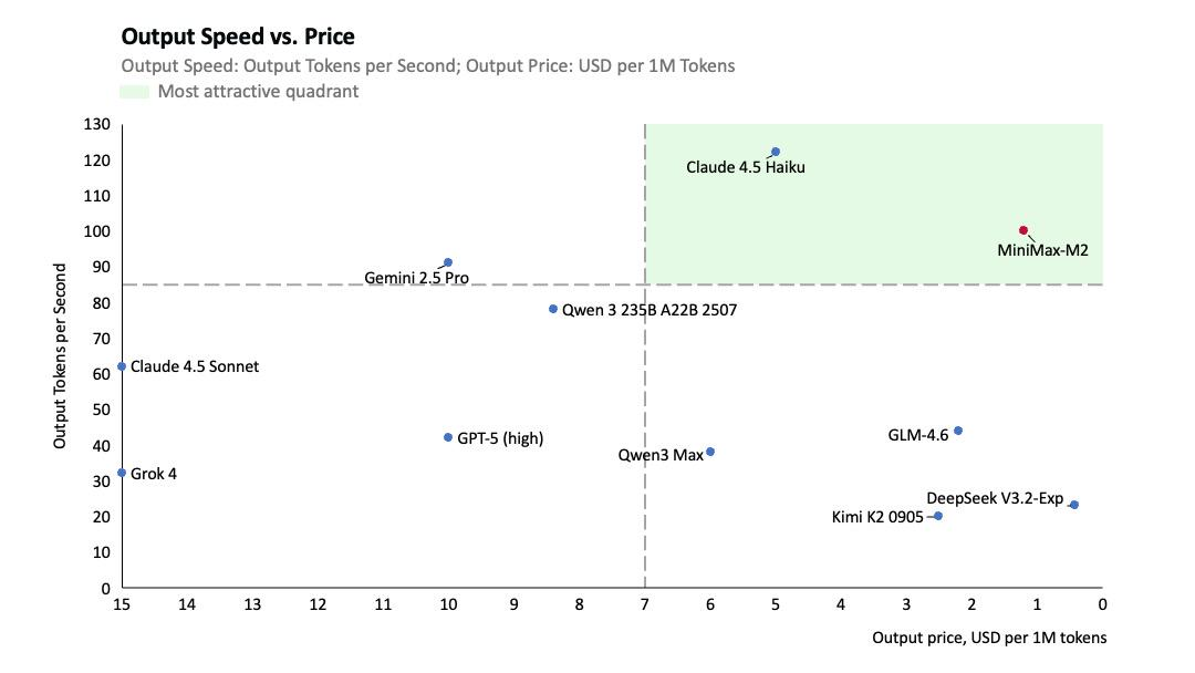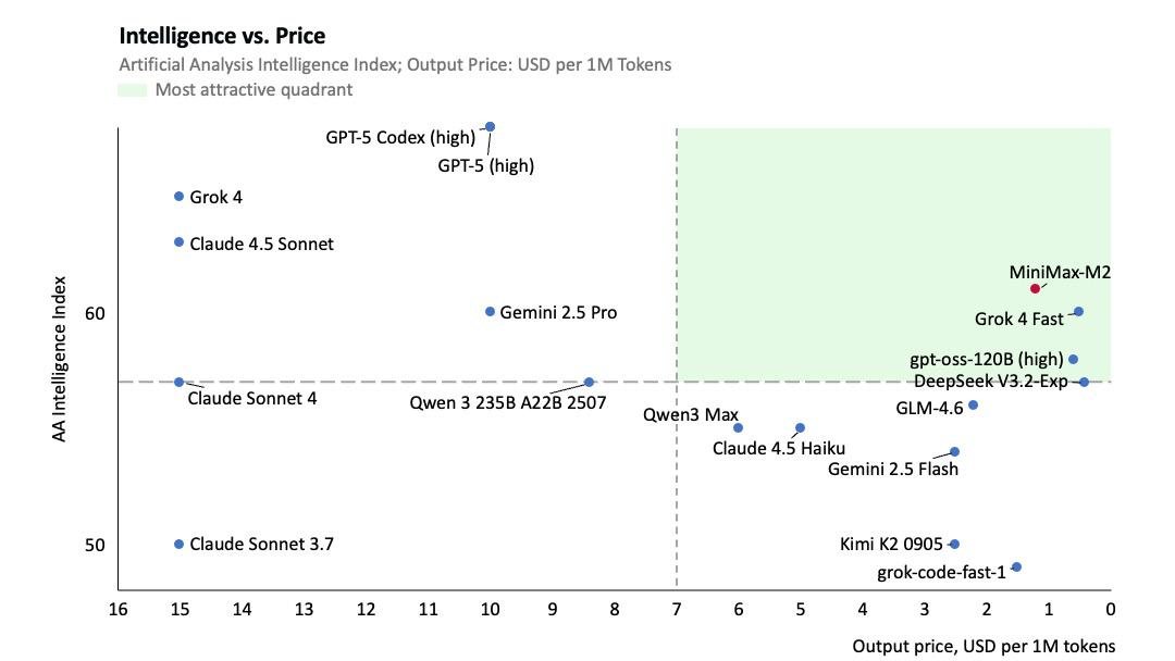 图中那个红点,就是 MiniMax-M2。它明确落在绿色区域的右上角——在目前这张图里,没有哪一款模型能在"智能水平"和"价格"两个维度上同时压过 M2。