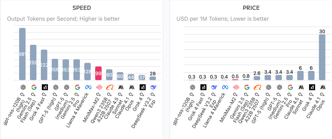 M2 的红点同样在绿色区域的右上角——约 100 tokens/s 的速度,配上全场最低的价格。Claude 4.5 Haiku 速度更快(120 TPS),但价格贵了 4 倍多。DeepSeek 价格接近,但速度只有 M2 的 1/4。