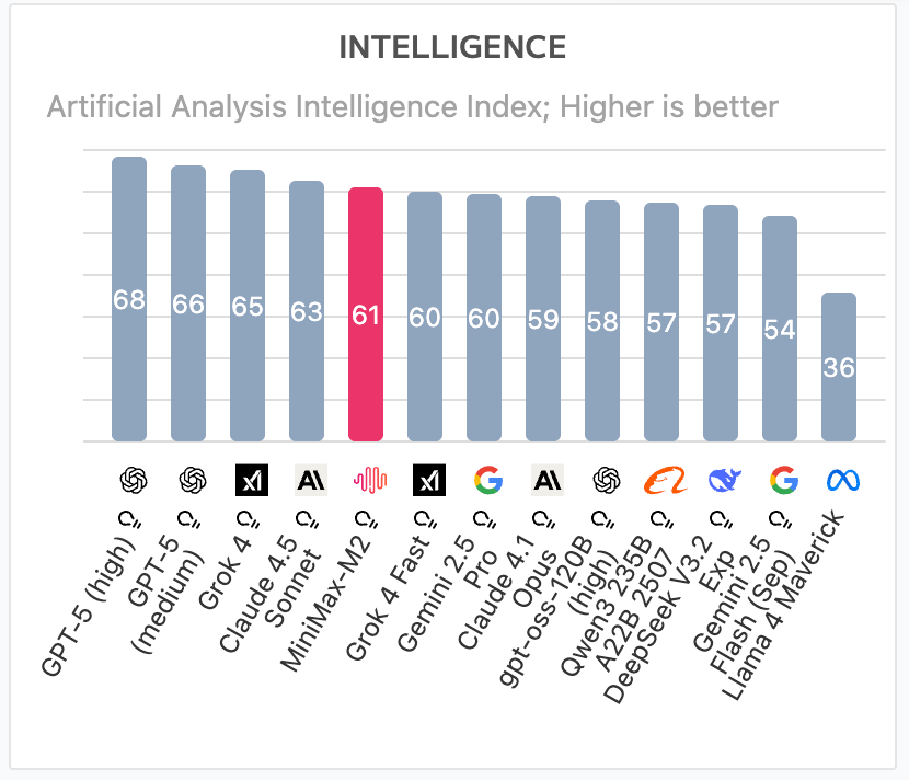 前面四个是 GPT-5、Grok 4、Claude 4.5,都是顶流。M2 拿了 61 分,前五里面唯一的国产模型。