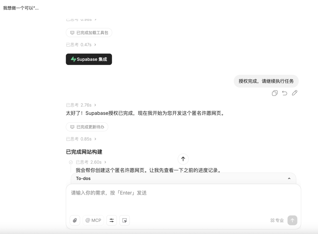 我只输入一句话,它立刻调起 Supabase 项目,自动完成数据库连接、前端页面开发、后端部署,全流程一把梭,不需要我写一行代码: