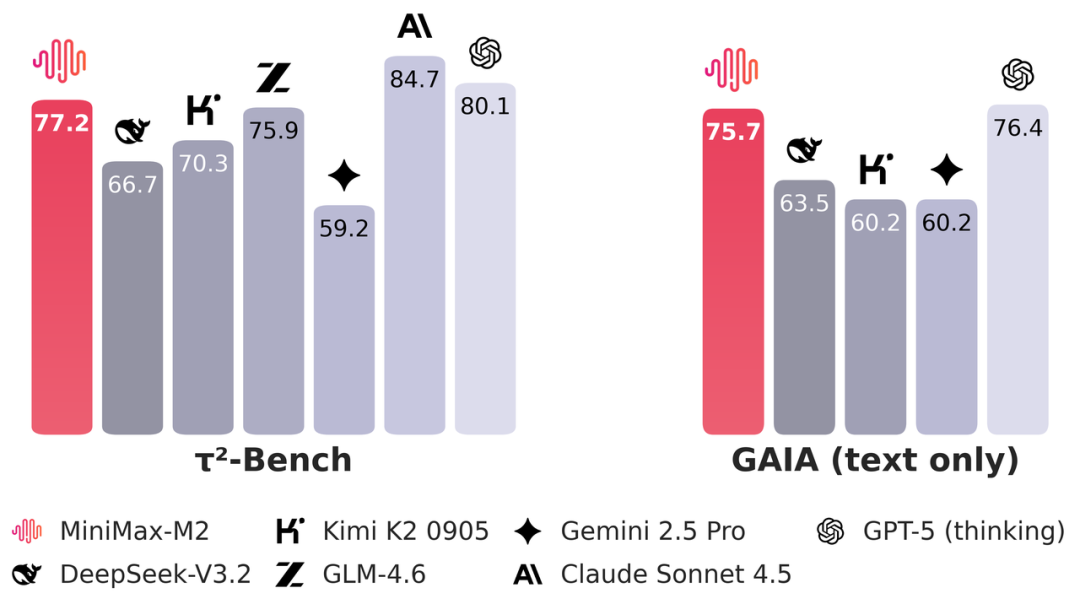 τ²-Bench 测试的是模型在复杂工具调用场景下的表现。M2 拿下 77.2 分,国产模型中排名第一,虽然和 Claude Sonnet 4.5、GPT-5 还有点差距。