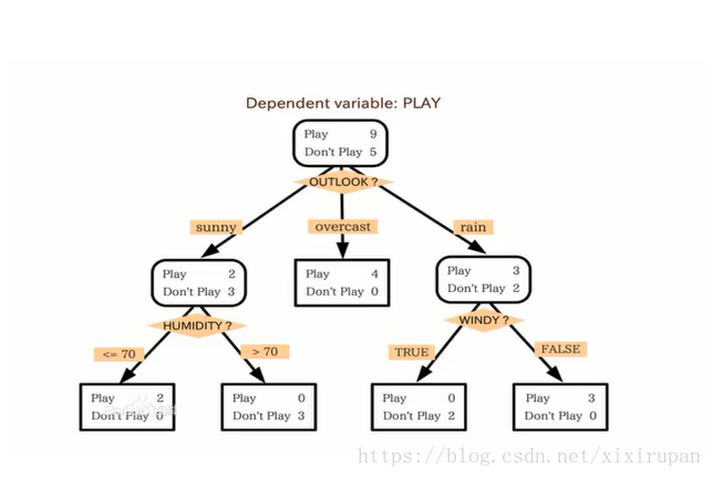决策树是一个类似于数据流程图的树结构:其中,每个内部节点表示一个属性上的测试,每个分支代表一个属性输出,而每个树叶结点代表类或者类的分布,树的最顶层是根结点
