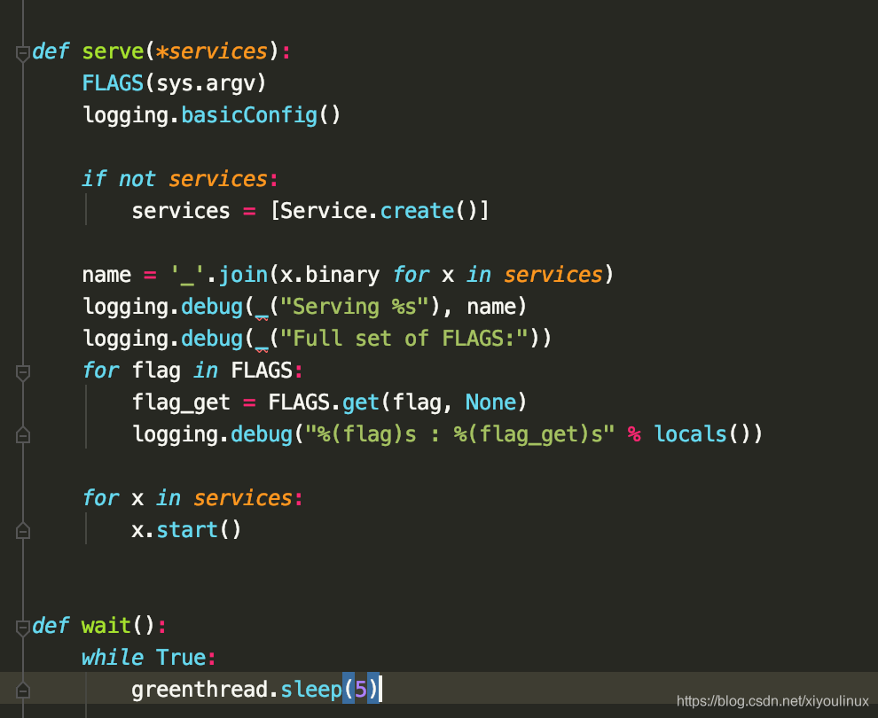 我们可以看到,每个服务都是导入了service模块以及util模块,service模块里serve方法会负责创建对应脚本启动的服务,并启动服务,然后wait就是一个无线循环,定期调用greenthread.sleep(5)让出cpu控制权限,给其他任务进行调度执行。