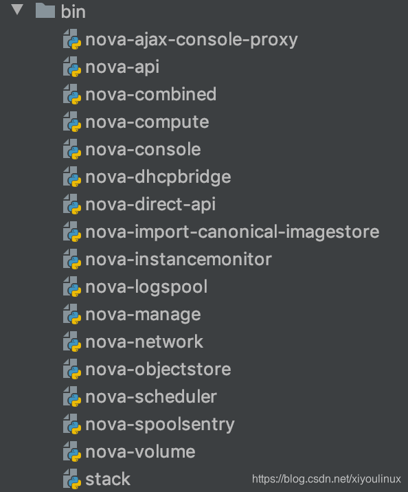 bin目录下的文件主要是nova各个服务启动的python脚本,从上图可以看出,主要有nova-api服务,nova-compute服务,nova-console服务,nova-network服务,nova-scheduler服务,nova-volume卷服务等。每个服务的基本代码结构如下: