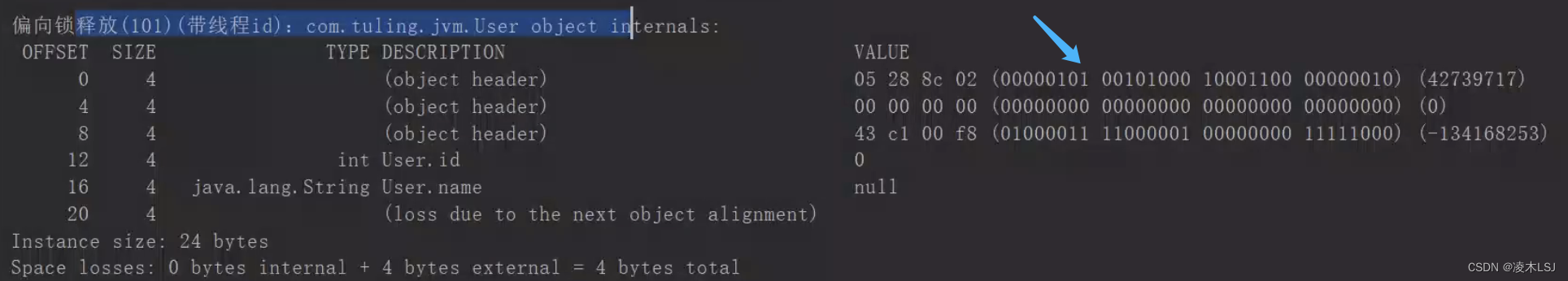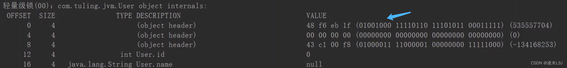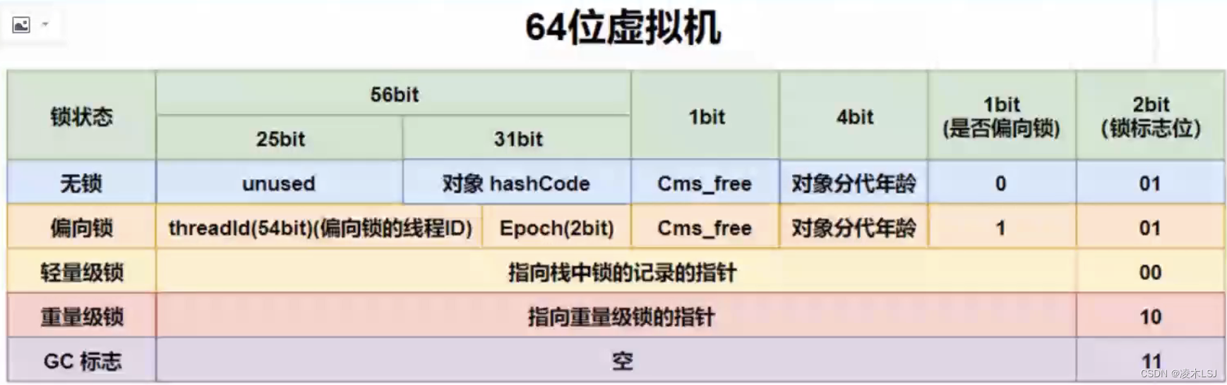 - 如果不存在线程竞争的一个线程获得了锁,那么锁就进入偏向状态, 此时 Mark Word 的结构变为偏向锁结构:锁对象的锁标志位(lock)被改为 01,偏向标志位 (biased_lock)被改为 1,然后线程的 ID 记录在锁对象的 Mark Word 中(使用 CAS 操作完成)。