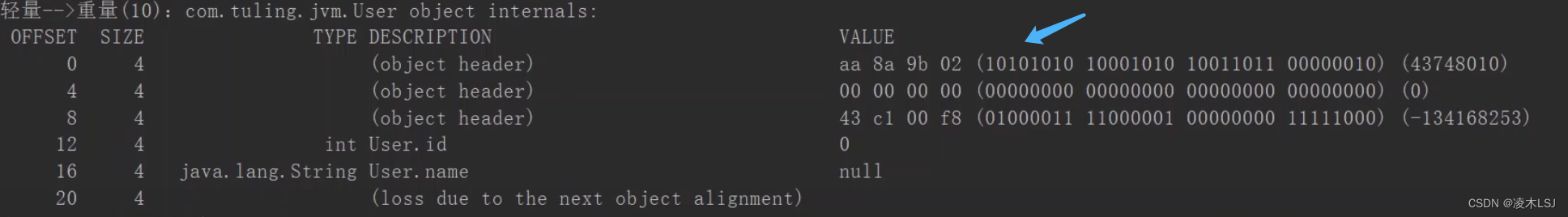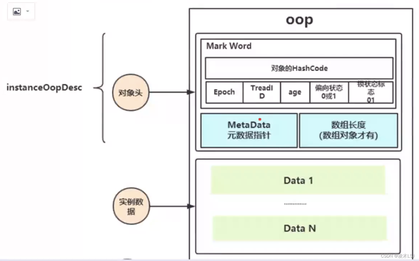 HotSpot中,Java的对象内存模型分为三部分,分别为对象头、实例数据和对齐填充。而对象头中分为两部分,一部分是“Mark Word”(存储对象自身的运行时数据,32bit或64bit,可复用);另一部分是指向它的类的元数据指针。