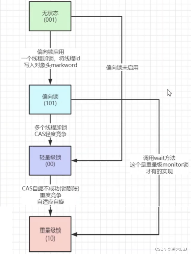 在Java SE 1.6中,锁一共有4种状态,级别从低到高依次是:无锁状态、偏向锁状态、轻量级锁状态和重量级锁状态。