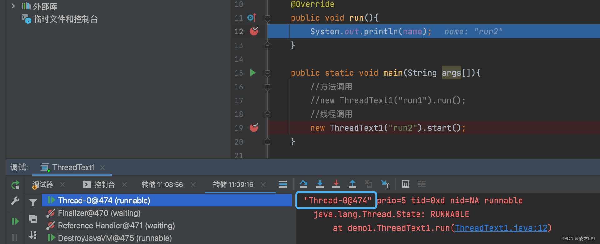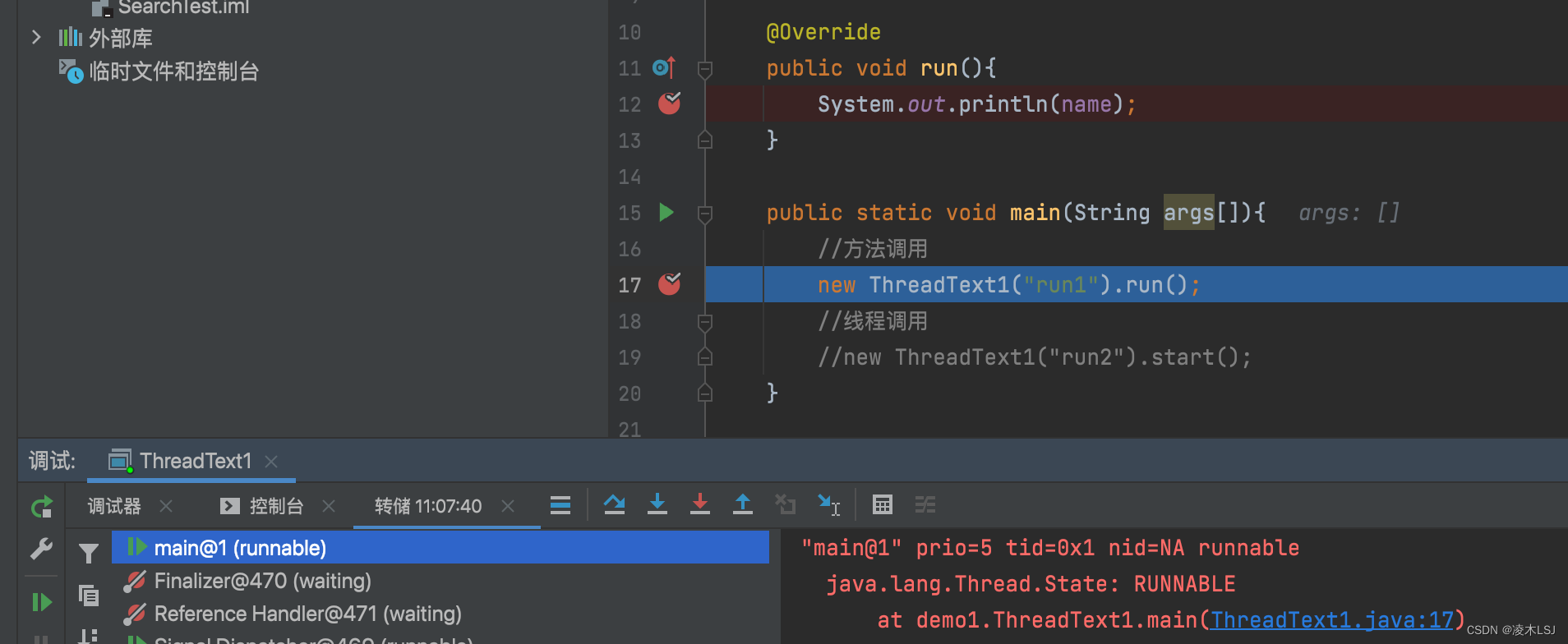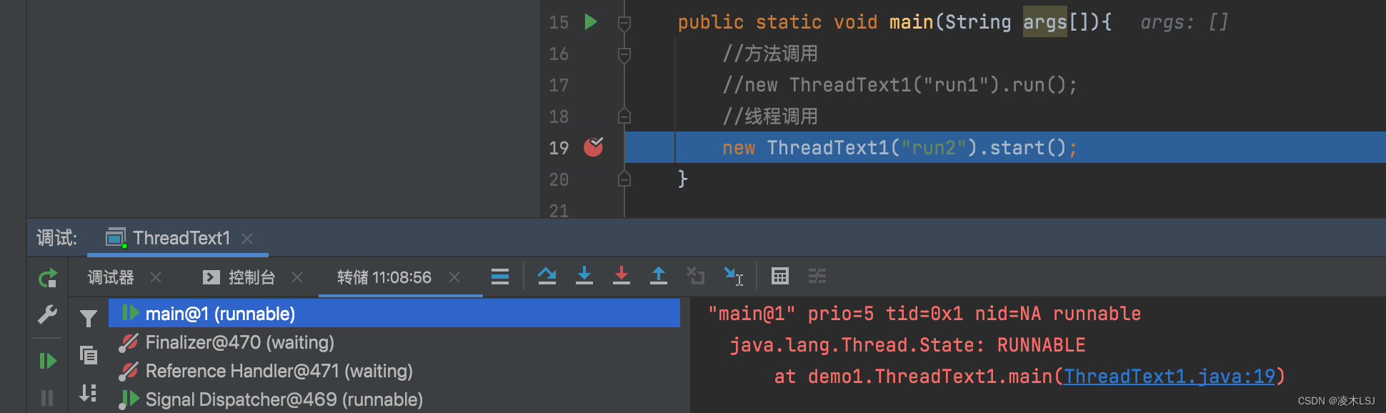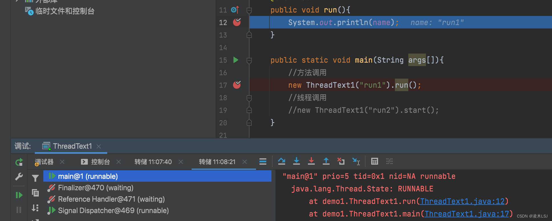 下断点调试信息,可以看到run()方法当前线程是“main@1”